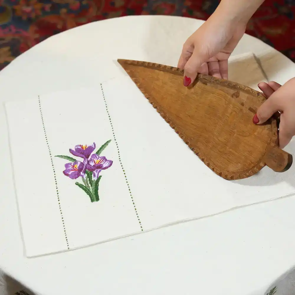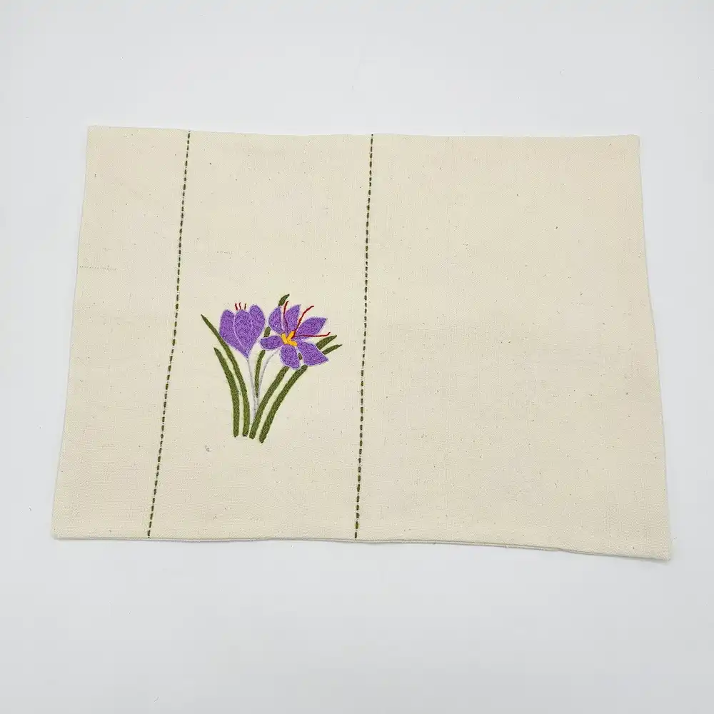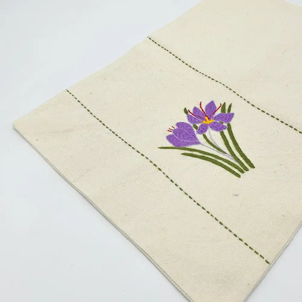 زیربشقابی گلدوزی زعفران نمونهای از هنر اصیل و زیبای گلدوزی سنتی دستی است که توسط زنان هنرمندشهرستان قائن در خراسان جنوبی با دقت و ظرافت بر روی پارچه پنبهای دستباف دوخته شده است. این اثر هنری جلوهای خاص و منحصربهفرد به میز پذیرایی شما میبخشد.